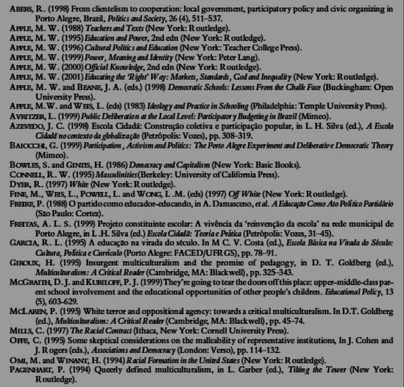 [4] Luis Armando Gandin and Michael W. Apple (2012), Can Critical democracy last? Porto Alegre and the struggle over “thick” democracy in education, Journal of Education Policy, vol.27, No. 5, September 2012, 621-639.
